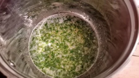 - Pour the wine into a large pot, add the butter and heat until the butter melts. Add the herbs, black pepper, onion, and garlic and bring it to a boil.